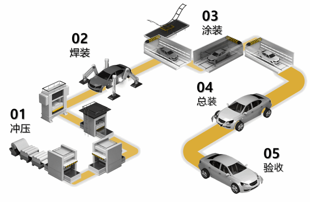 汽车制造包括五大工艺(如下图所示),冲压、焊装、涂装、总装、验收,一条龙流水线作业完成从白车身的焊接到对车身外观进行处理再到整车组装的过程。